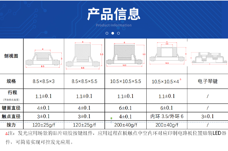 优势:表贴硅胶按键应用市场广阔,成型方案适用于不同应用场合和尺寸的按键,通用性强,自动化贴片,综合应用成本低于传统非贴片按键,且性能更优,具有完善的配套专利技术池;