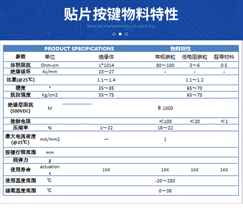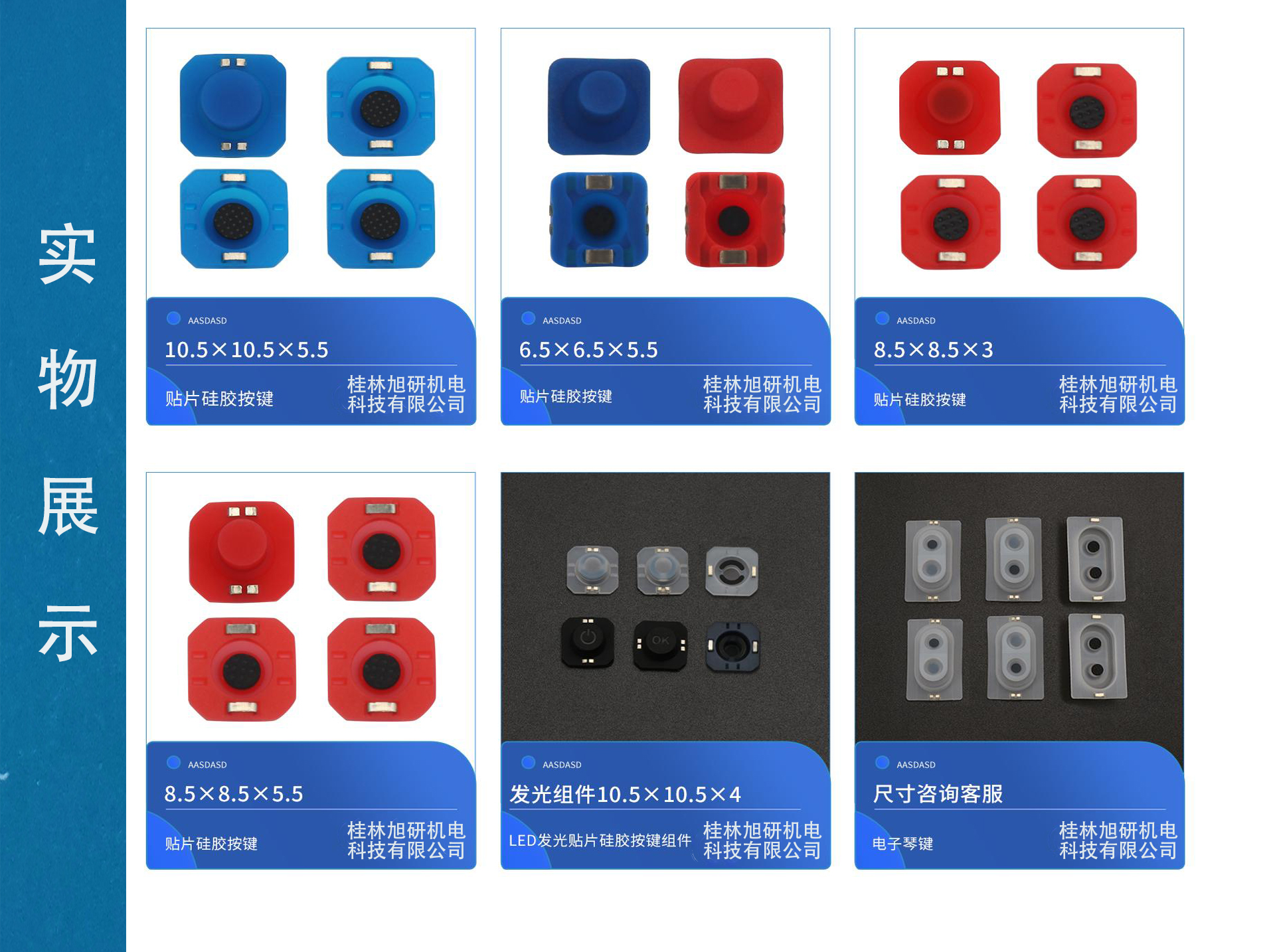 新型贴片式硅胶弹性按键技术,实现不同应用场合的硅胶弹性按键产品的表面贴装化和标准化。新型贴片按键适应自动化大生产的需求,提高了电子产品的组装密度和生产效率,易于实现不同产品的通用性,有利于不同产品的硅胶弹性按键规范化及标准化。从适用场合、不同性价比需求等角度,已经形成了两款常规贴片按键、一款高性价比贴片按键、一款发光贴片按键的系列产品,且制定的《贴片单体导电硅胶弹性按键详细规范》已立项电子行业标准。上述专利产品,仿冒必究!