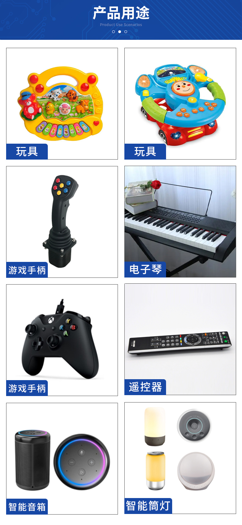 应用产品包括但不限于电子玩具、遥控设备、智能音箱、智能筒灯
