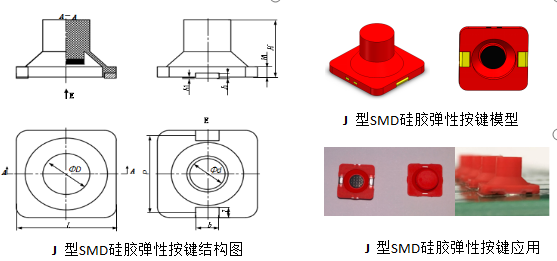 J 型SMD硅胶弹性按键的引脚成J 型,J形引脚与硅胶一体化成型。J型引脚耐焊接性比较好,具有良好的工艺性、可靠性,可用在恶劣的工作环境中使用。